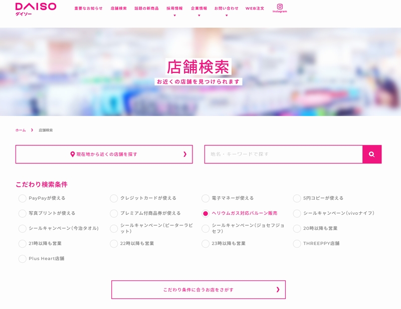 公式サイトでヘリウムガス対応バルーン販売を選択して検索するとマップが開いて対応している店舗がわかります。