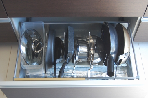 台所のシンク下にあるフライパン・鍋の収納。