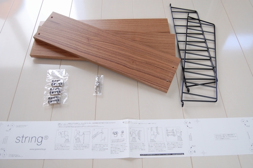 ストリングポケットフレーム、棚板、金具、取り付けガイドとアンカーボルトです。