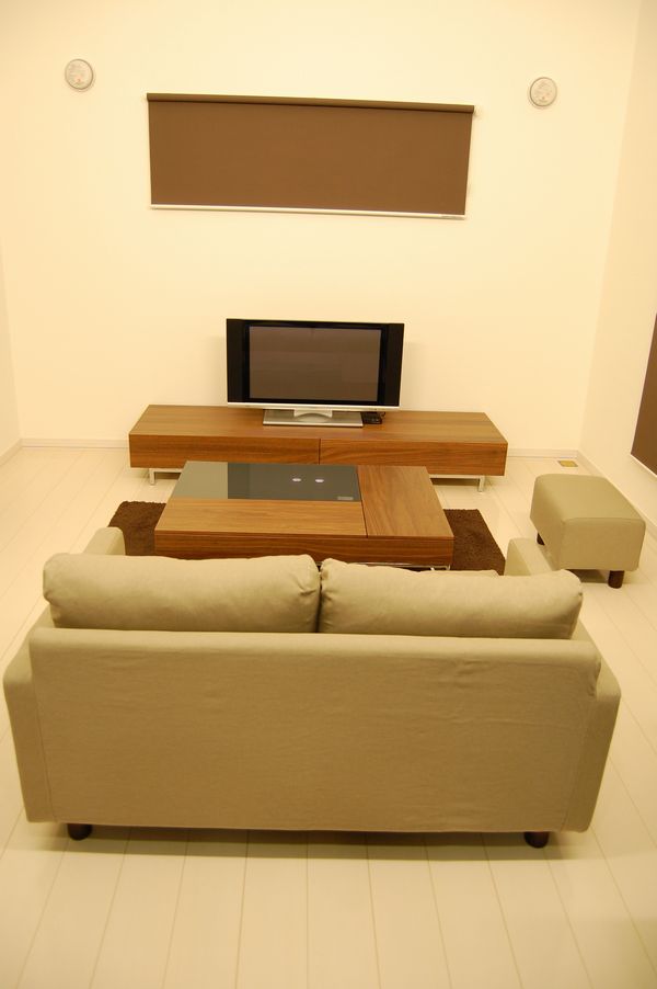 TVボード、テーブル、ソファーが揃ったので家具ありのリビングの平屋web内覧会です。