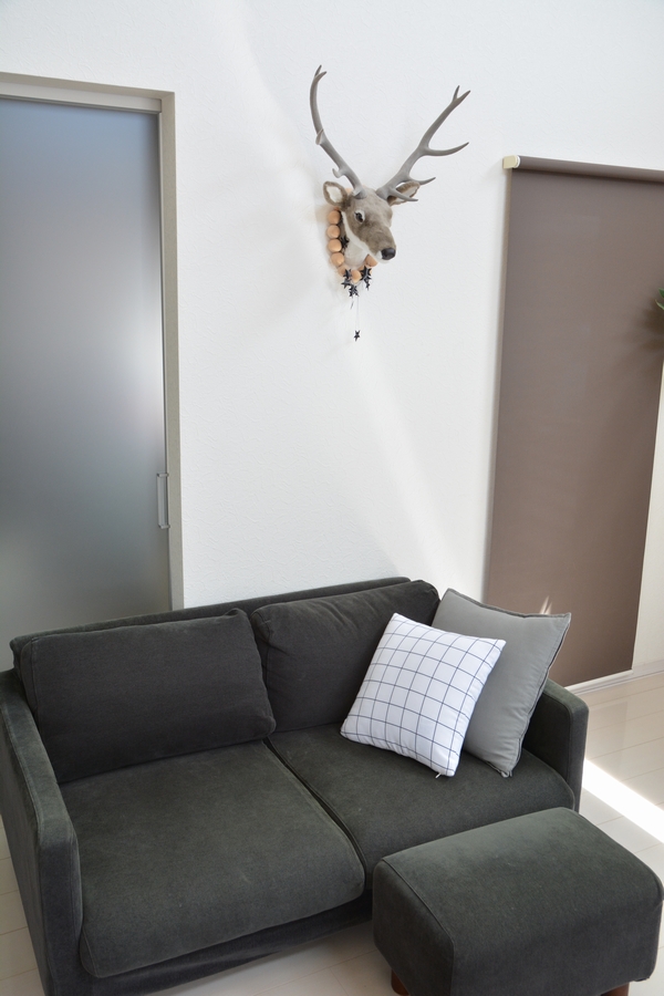 ソファーの後ろにクリスマス前から飾ってあるハンティングトロフィー。