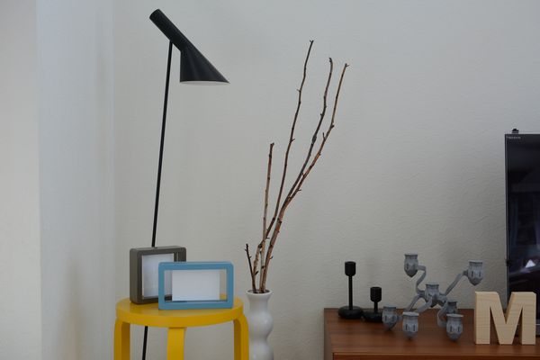 ここにイエローのstool60を置いてフォトフレームを。