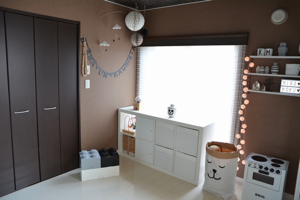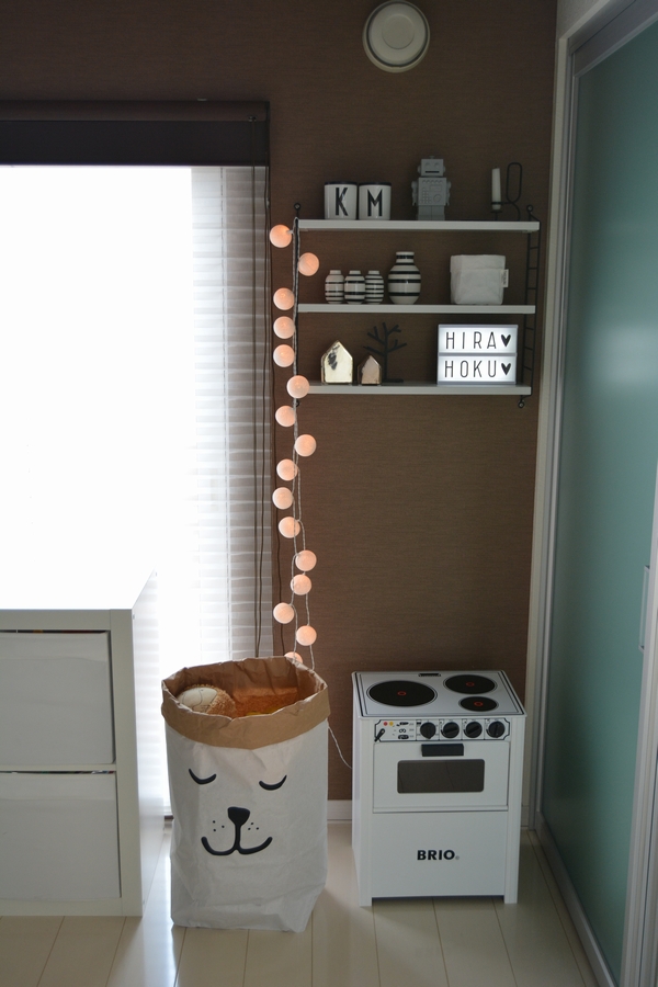 わが家では子供部屋のメイン収納として使っています。白で統一した部屋に、ストリングポケットの棚・かわいい照明・BRIOのキッチンと組み合わせて、北欧風の子供部屋にしました。